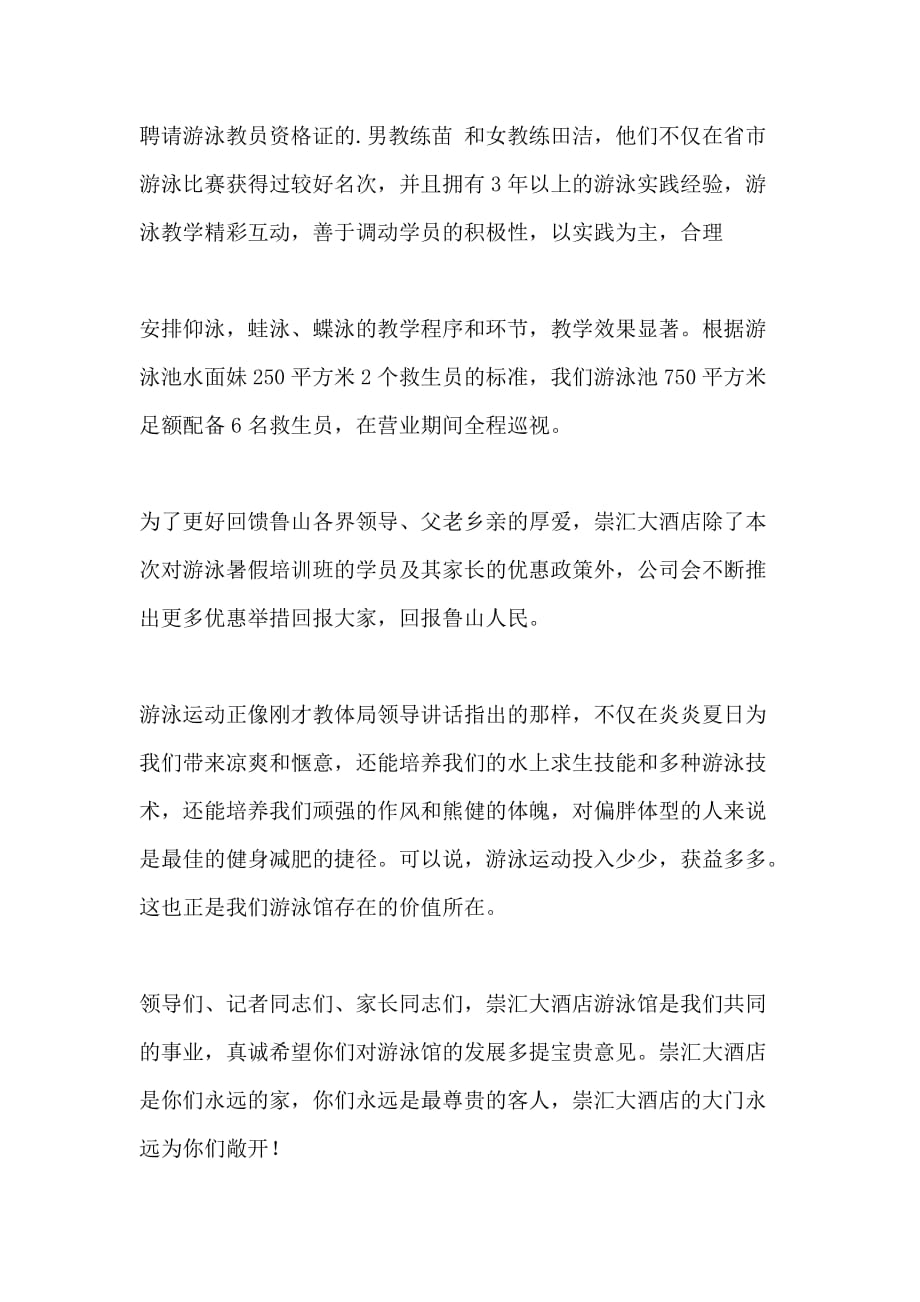 游泳比賽廣播稿:回溯歷程,頌揚(yáng)水中英雄。運(yùn)動(dòng)員們?cè)谟境刂袚]灑汗水,展現(xiàn)頑強(qiáng)拼搏的精神。從預(yù)賽到?jīng)Q賽,每一次躍入水中都是對(duì)自我的挑戰(zhàn)與超越。水中激戰(zhàn),見(jiàn)證速度與激情的碰撞,觀眾們的歡呼與掌聲為賽場(chǎng)增添熱烈氣氛。英雄們的輝煌時(shí)刻到來(lái),成績(jī)揭曉,榮耀屬于每一位水中拼搏的勇士。